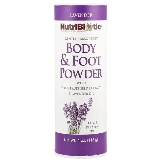 Пудра для тела и ног NutriBiotic питает кожу, впитывая влагу и уменьшая трение. Эта мягкая формула с ароматом лаванды, на 100% без талька, содержит кукурузный крахмал, экстракт семян грейпфрута и масло лаванды.