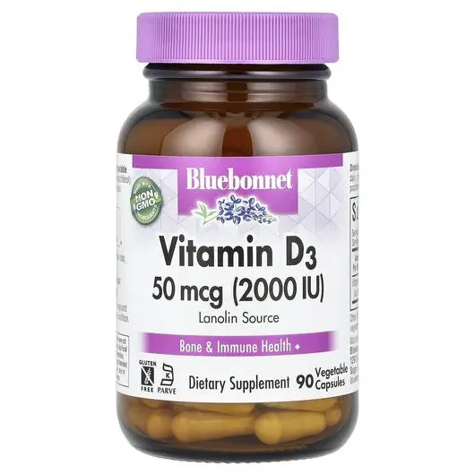 Овощные капсулы Bluebonnet с витамином D3 2000 МЕ (50 мкг) содержат витамин D3 (холекальциферол) из ланолина, который поддерживает крепкие здоровые кости и иммунную функцию.
