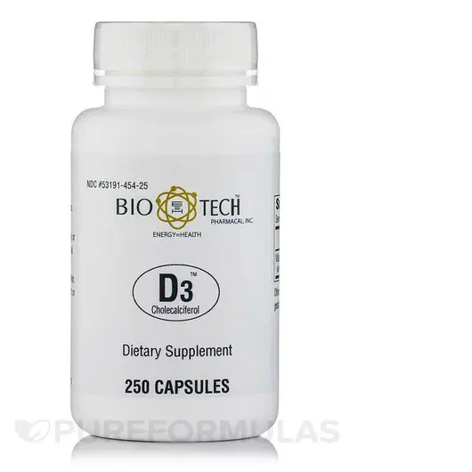 Холекальциферол D3 от Bio-Tech Pharmacal содержит 1000 МЕ (международных единиц) витамина D3 в каждой капсуле. Витамин D может помочь поддерживать общее состояние здоровья несколькими способами; например, поскольку витамин D способствует усвоению кальция, эта добавка может способствовать сохранению костной массы.