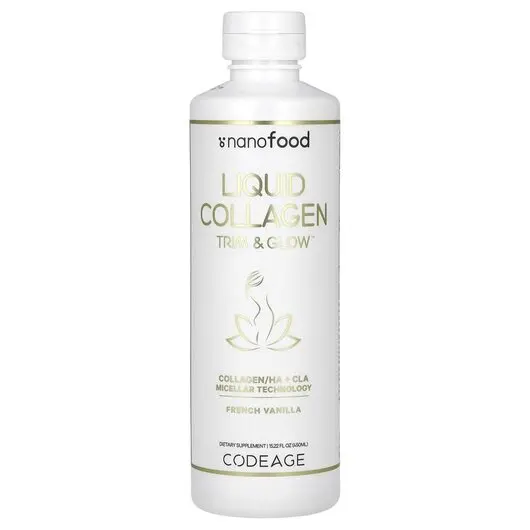 Попробуйте Codeage Nanofood Liquid Collagen Trim & Glow, современную добавку жидкого коллагена с гиалуроновой кислотой, CLA, витамином Е и другими ингредиентами, которые помогают поддерживать кожу, суставы и волосы. Эта коллагеновая жидкость поставляется с липосомальной доставкой для биодоступности и абсорбции.