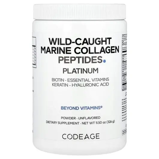 Codeage Wild Caught Marine Collagen Peptides Powder Platinum — это высококачественная коллагеновая добавка, изготовленная из морского коллагена, выловленного в дикой природе из холодных вод Северной Америки. Он содержит высокий уровень порошка гидролизованного рыбьего коллагена типов 1 и 3, 10 000 мкг биотина, витамин С, витамин D3, витамин B6, ниацин, пантотеновую кислоту и гидролизованный кератин.
