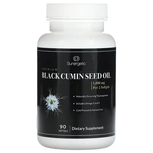 Масло черного тмина премиум-класса от Sunergetic содержит незаменимые жирные кислоты природного происхождения и тимохинон, соединение с антиоксидантными свойствами.