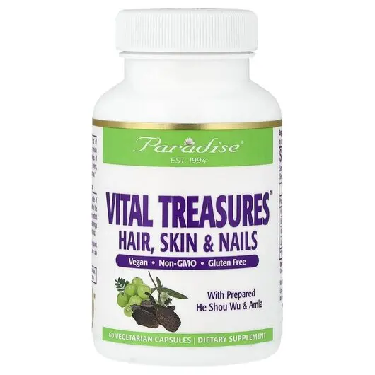 Формула Vital Treasures для здоровья волос и кожи содержит горец многоцветковый, эклипту, бирючину и амлу — четыре из самых известных трав, которые способствуют здоровью волос и кожи, а также поддерживают цвет и густоту волос.