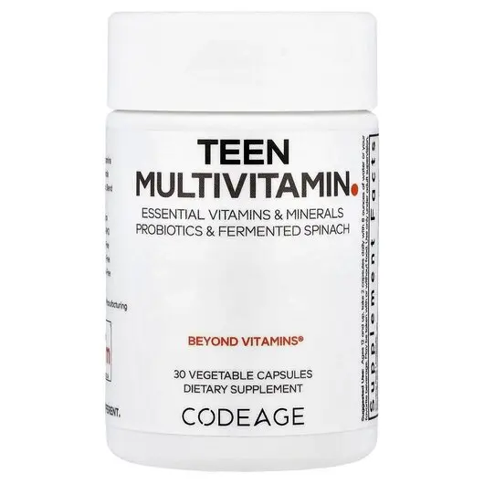 Добавка Codeage Teen Multivitamin содержит необходимые витамины, минералы и пробиотики для подростков. Эта веганская формула без ГМО также включает ферментированный порошок листьев шпината и содержит витамины A, C, D3, B6, B12, фолиевую кислоту, магний, цинк и железо. Предназначена для подростков от 12 лет и старше.