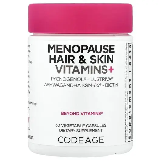 Витамины Codeage Menopause Hair & Skin Vitamins+ — это премиальная добавка, содержащая Lustriva, запатентованный комплекс биотината магния и связанного силиката аргинина, который содержит особые формы биотина и кремния. Клинические исследования показали, что этот комплекс стимулирует рост волос, делая их более густыми и объемными, а также поддерживает здоровый вид кожи. В период менопаузы у женщин иногда могут наблюдаться изменения в состоянии волос и кожи.