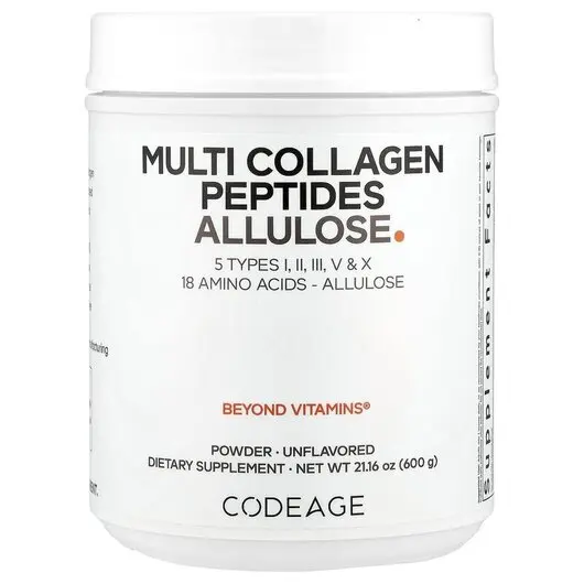 Codeage Multi Collagen Peptides Allulose — это уникальная формула добавки, сочетающая 5 видов коллагена с 18 аминокислотами и аллюлозой, редким сахаром с чистым, слегка сладким вкусом. В ней 0 калорий, 0 чистых углеводов и 0 гликемических индексов, что делает её уникальной, не имеющей вкуса и удобной для смешивания порошковой добавкой на основе коллагена и аллюлозы.