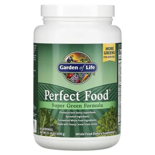 Супер зелена формула Perfect Food містить більше зелені на порцію, ніж інші формули зелених харчових добавок. Виготовлена з овочевих, паросткових та органічно вирощених злакових трав, одна порція еквівалентна 140 г свіжого трав'яного соку, щоб ваше тіло отримувало харчові переваги від кількох порцій фруктів та овочів.