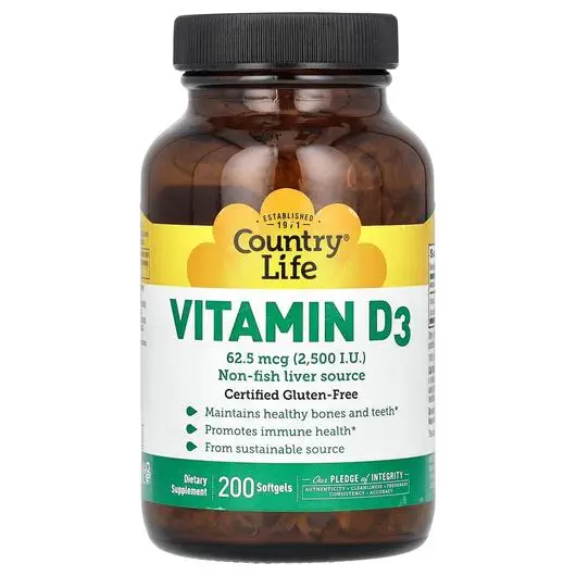 Вітамін D необхідний для сприяння засвоєнню кальцію, який допомагає формувати й підтримувати здоровий стан кісток і зубів, а також підтримувати функціонування імунної системи.. Вітамін D3 Country Life (2500 МО) отримують із ланоліну, екологічного й безпечного джерела, в основі якого лежать середньоланцюгові тригліцериди (MCT). Також доступні концентрації 1000 МО, 2500 МО та 5000 МО.