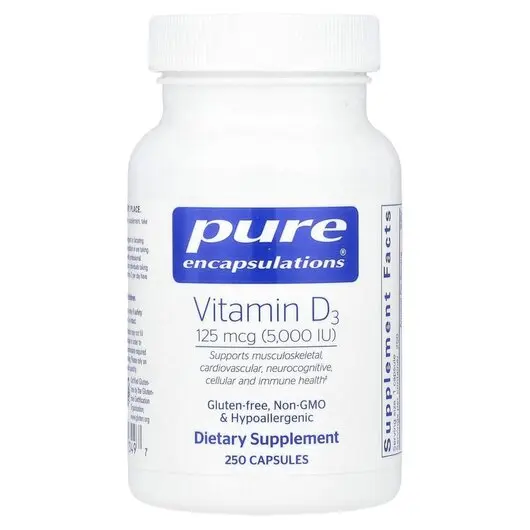 Розмір порції: 1 капсула Порції в упаковці: 250 Кількість на порцію / Вітамін D (у вигляді холекальциферолу) (D3) 125 мкг (5000 МО) / 625% відсотків добової норми (DV). Інші інгредієнти: Гіпоалергенна рослинна клітковина (целюлоза) вегетаріанська капсула (целюлоза вода). Без глютену / ГМО / Гіпоалергенний.