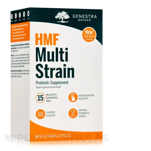 HMF Multi Strain пропонує повну комбінацію з 16 пробіотичних штамів, які сприяють здоровій мікрофлорі кишківника. Кожна стабільна капсула містить різноманітні штами, які сприяють колонізації як тонкого, так і товстого кишківнику. У плацебо-контрольованому дослідженні було показано, що пробіотичний штам HN019, який входить до складу цієї формули, підтримує здорову мікрофлору кишківника. Це значно збільшило кількість біфідобактерій і лактобактерій, одночасно зменшивши популяцію ентеробактерій (рід, який включає багато патогенних бактерій). Подібним чином, консорціум пробіотиків HMF від Genestra, Lactobacillus acidophilus (CUL-60 і CUL-21), Bifidobacterium bifidum (CUL-20) і Bifidobacterium animalis subsp. lactis (CUL-34), що міститься в HMF Multi Strain, як було продемонстровано в ході клінічних випробувань, підтримує абдомінальний комфорт і сприяє здоровому балансу мікрофлори в шлунково-кишковому тракті. Цей зручний стабільний формат має ефективність, гарантовану до кінця терміну придатності, і може покращити дотримання пацієнтом режиму. Комбінація пробіотиків із 16 штамів Забезпечує 15 мільярдів КУО на капсулу з комбінації 16 штамів Підтримує здоров'я шлунково-кишкового тракту, абдомінальний комфорт і здорову мікрофлору Збалансовує склад мікрофлори Не потребує охолодження Ефективність гарантована до закінчення терміну придатності