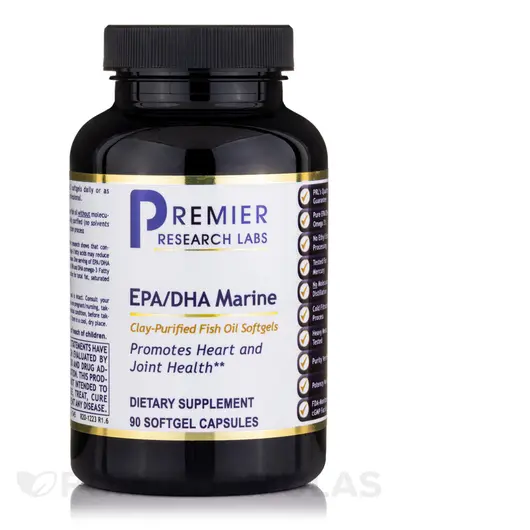 Живіть свій мозок, підтримуйте суглоби та сприяйте здоровю серцево-судинної системи за допомогою чистих EPA/DHA омега-3 жирних кислот! EPA/DHA Marine Softgels містить натуральну докозагексаєнову кислоту (DHA) та ейкозапентаєнову кислоту (EPA) з оригінального рибячого жиру без молекулярної дистиляції. Процес холодної фільтрації Premier Research Labs не вимагає важких маніпуляцій, високотемпературної обробки або використання жорстких розчинників для розділення EPA та DHA. Нарешті чистий повністю натуральний рибячий жир! Цей рибячий жир є очищеним рибячим жиром, який природним чином очищається для видалення забруднень і насичених жирних кислот, щоб залишити лише здорові тригліцериди у вигляді поліненасичених жирних кислот OMEGA-3 у формі DHA та EPA. Його природно захищають від окислення за допомогою суміші токоферолу та інших відповідних антиоксидантів. У процесі пакування рибячого жиру використовується фільтрація та захист від інертного газу для подальшого забезпечення чистоти та збереження продукту. Очищений глиною глибоководний рибячий жир без молекулярної дистиляції; природне очищення (без використання розчинників) за допомогою процесу холодної фільтрації