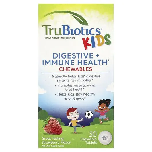 Ваші діти будуть в захваті від нової смачної полуниці TruBiotics Kids Chewables! Це єдині дитячі жувальні продукти з 2 найбільш клінічно дослідженими пробіотичними штамами у світі. Клінічно доведено, що ця потужна комбінація корисних бактерій допомагає травній системі дітей працювати безперебійно, зменшує дискомфорт у верхніх дихальних шляхах, зменшує кількість пропущених днів у дитячому садку та підтримує їхню імунну систему, що розвивається. Для неперевершеної підтримки імунної системи травлення щодня поповнюйте мікробіом вашої дитини дитячими жувальними продуктами TruBiotics.