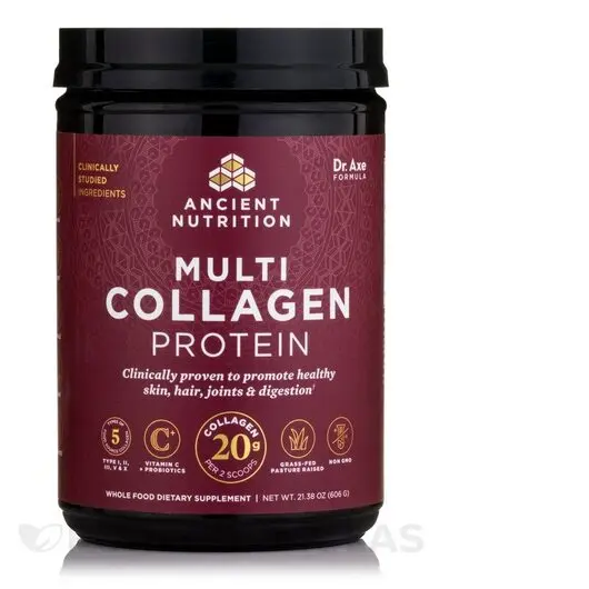 Отримайте повну необхідну поживну підтримку з білком Multi Collagen від Ancient Nutrition. Суміш десяти типів колагену з чотирьох різних харчових джерел, ця першокласна формула забезпечує широкий спектр переваг для здоров'я вашого волосся, шкіри, нігтів і суглобів у кожній порції! Крім того, він збагачений такими ключовими інгредієнтами, як вітамін С і пробіотики, щоб захистити вашу кишкову флору, одночасно сприяючи здоровому травленню, тож ви насолоджуватиметеся реальними результатами зсередини.
