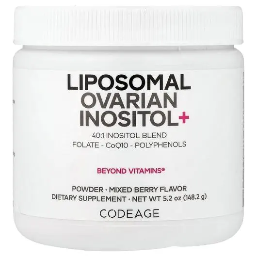 Codeage Liposomal Ovarian Inositol+ це харчова добавка, розроблена для жінок, створена для підтримки благополуччя яєчників і гормональної рівноваги шляхом включення міоінозитолу, D-хіроінозитолу, 5-MTHF фолієвої кислоти, фітосоми CoQ10, дикої чорниці та екстракту граната. . Особливості ліпосомальної доставки для поглинання та біодоступності.