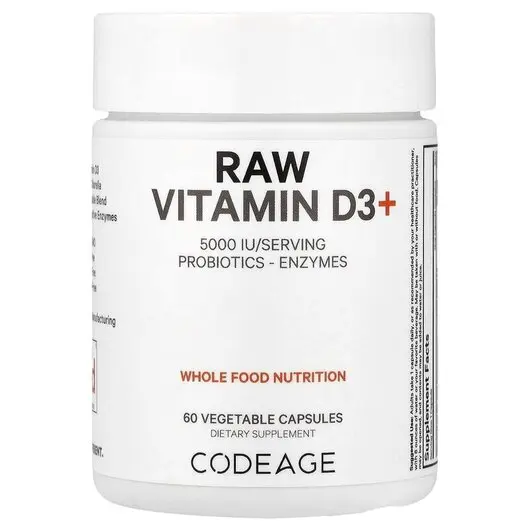 Codeage Raw Vitamin D3+ поєднує 5000 МО вітаміну D3 з органічними фруктами, овочами, Омега-9, ферментами та пробіотиками для цілісної повноцінної їжі та підтримки здоров'я. Запас на 2 місяці.
