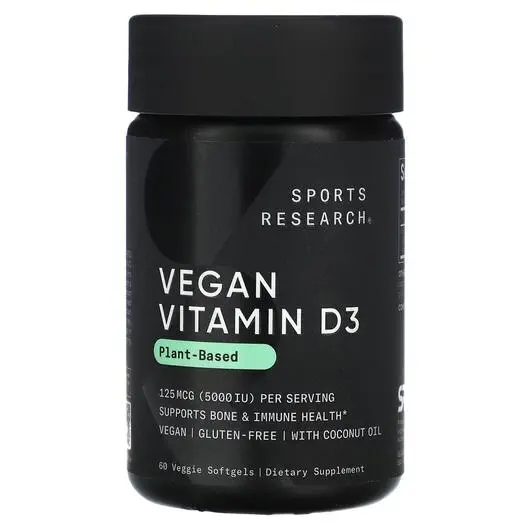 Sports Research Vegan D3 з кокосовою олією першого віджиму містить Vitashine, рослинний вітамін D3, отриманий з лишайника. Щоденне споживання вітаміну D3 має важливе значення для засвоєння кальцію та підтримки міцних і здорових кісток і зубів.