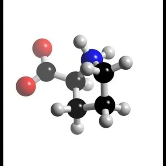 L-Пролін – це циклічна амінокислота, що має унікальну структуру. Її особливість полягає у тому, що вона містить піролідинове кільце, яке надає їй жорсткої форми та відіграє важливу роль у стабілізації просторової структури білків.